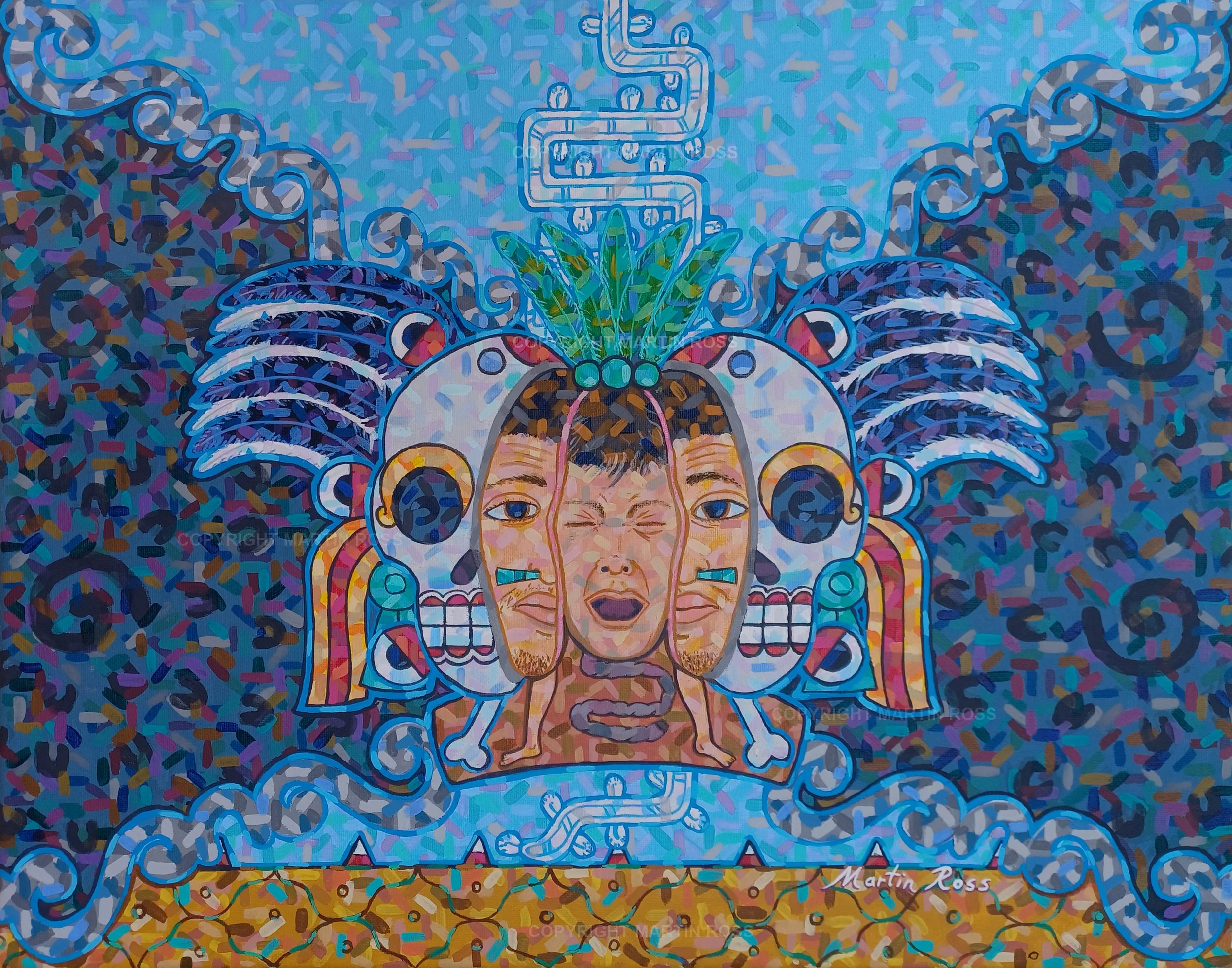 the Martin Ross Style is a Painting Technique that consists of a Traditional Painting as the Background topped with a Pattern of Rectangular Brush Strokes where every singular Rectangle is Not in a Parallel direction to the surrounding ones in a Particular color and the same applies to all of the other different colors overlapping to resemble Falling Confetti.